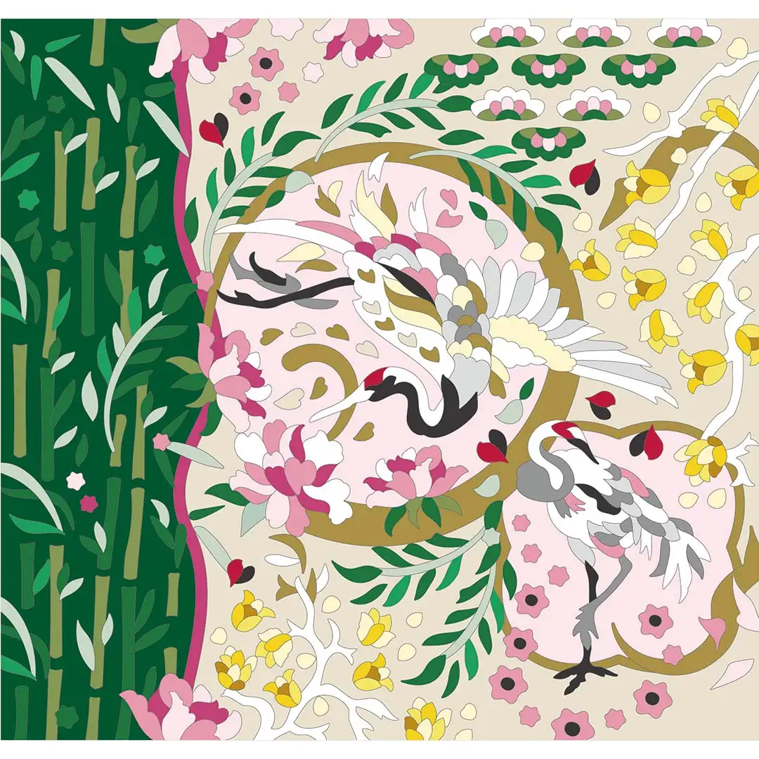 自然のうつろいに美を見出す「花鳥風月」の世界を、牡丹を中心に、蝋梅を添えて華やかに描いた塗り絵です。